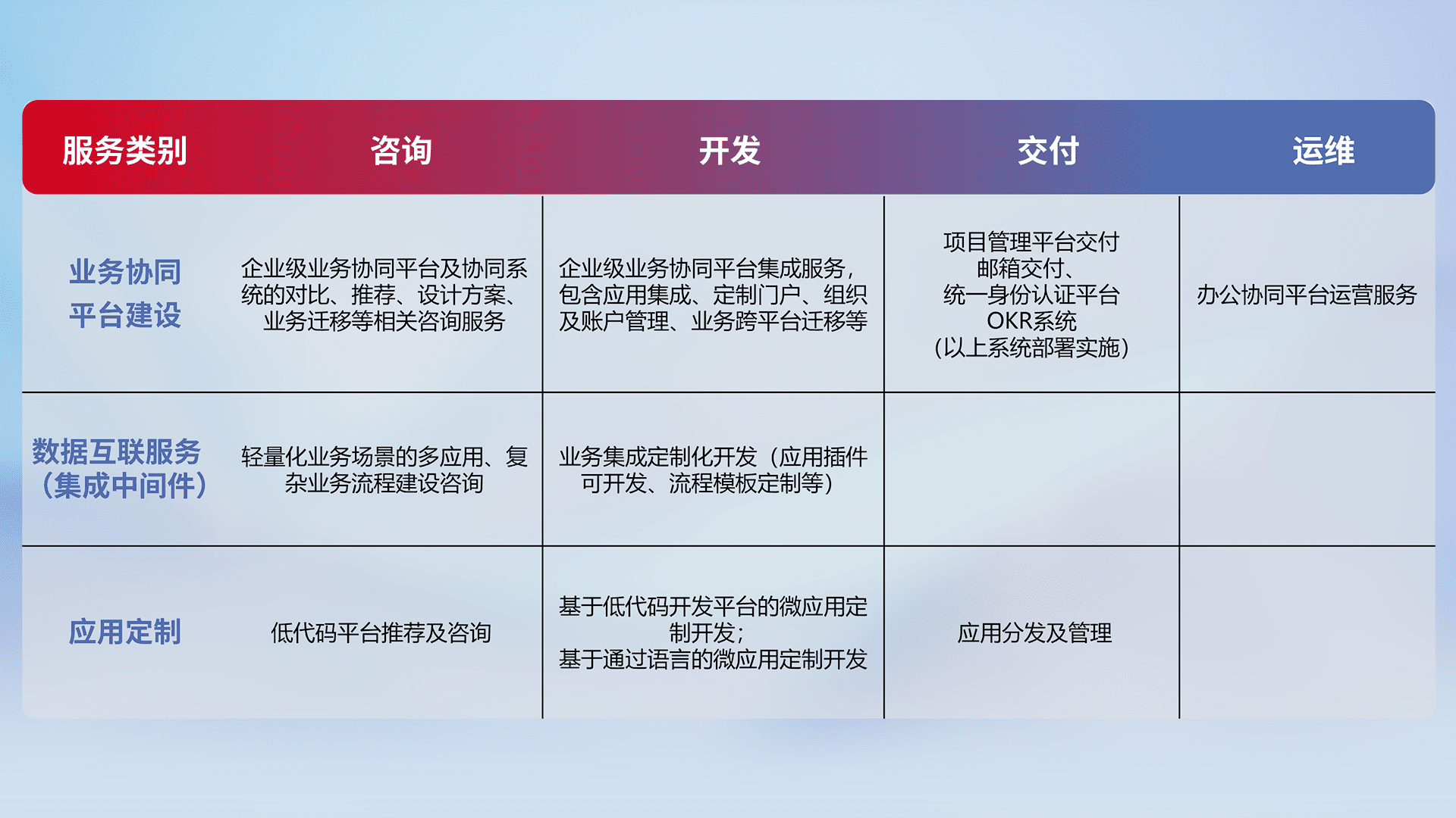 针对钉钉、、、、企微、、IDaas等平台级产品提供产品的规划、、、方案、、交付、、定制化开发等服务,,实现如统一协同办公、、、、智能客户服务、、、混合会议管理、、、智能数据查询、、、等业务场景,,,,实现数字化转型。。